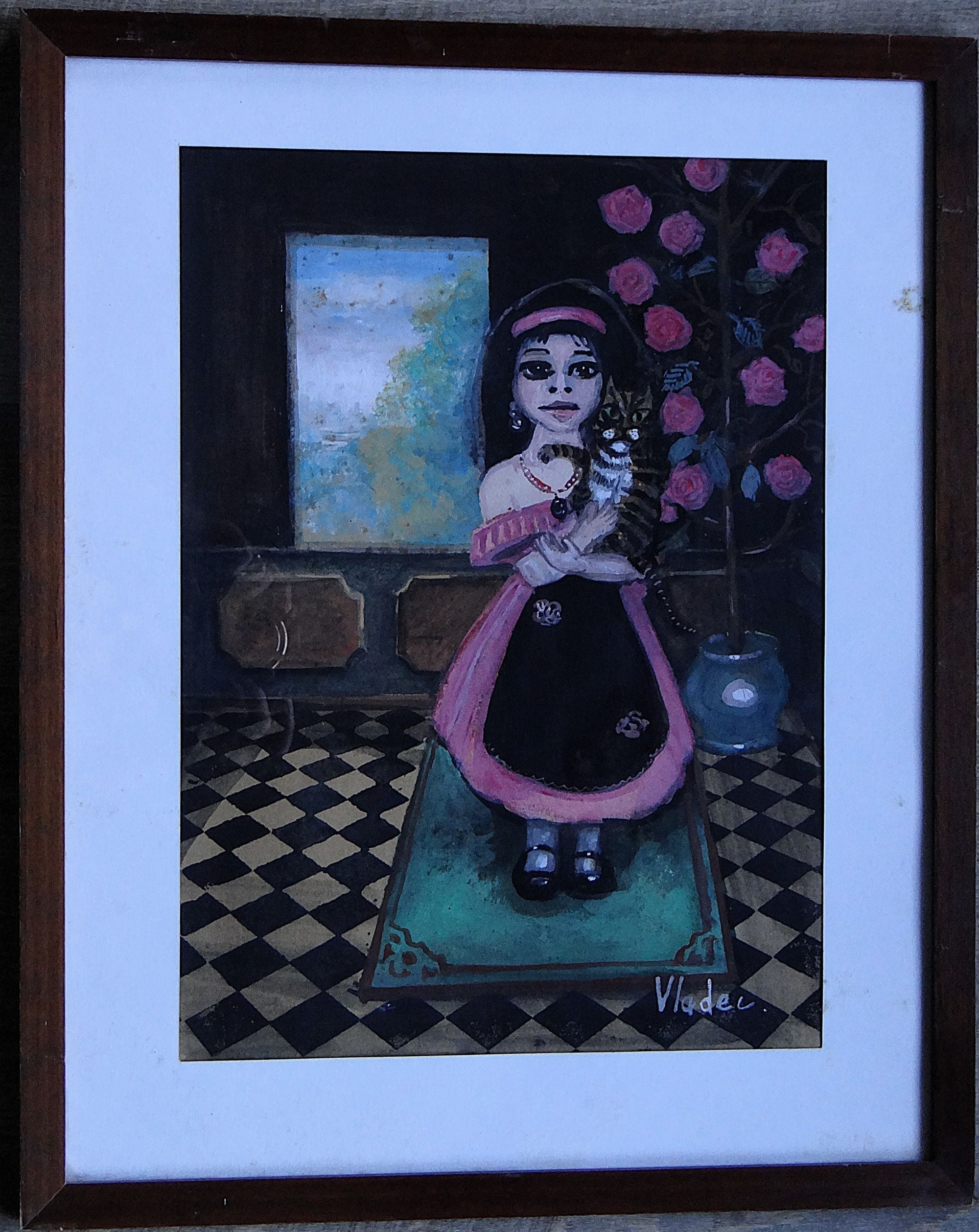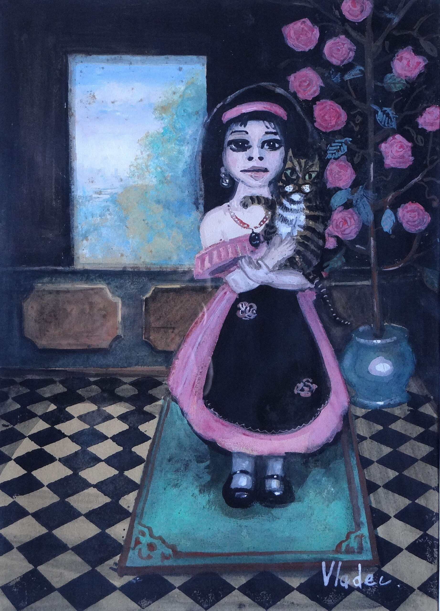 Découvrez La Fillette au Chat, une aquarelle originale et captivante signée Vladec.