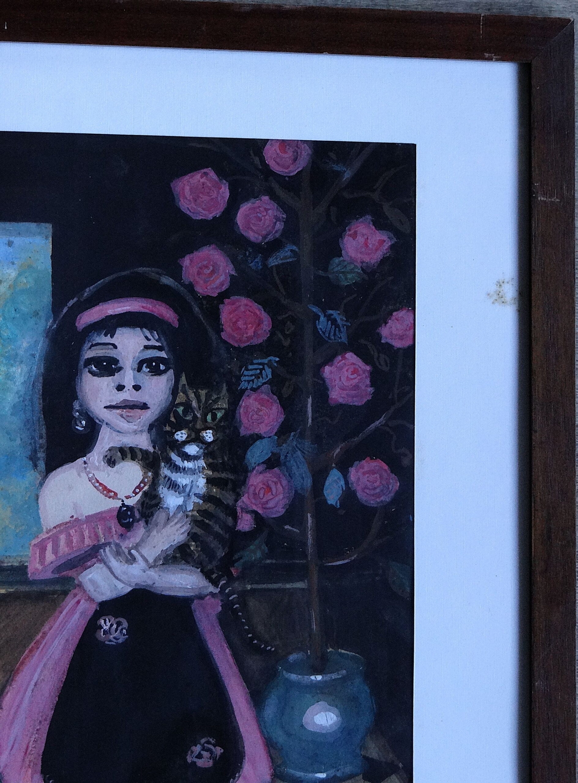 Cette petite fille au regard intense, avec ses grands yeux sombres et mystérieux, tient tendrement un chat dans ses bras. Son expression étrange et hypnotique confère à l’œuvre une présence presque surnaturelle, pleine de poésie et de douceur mélancolique.