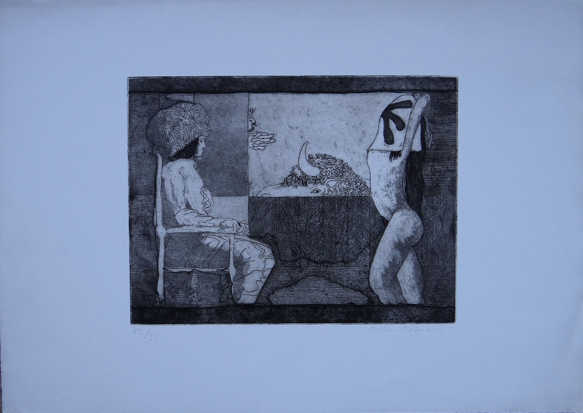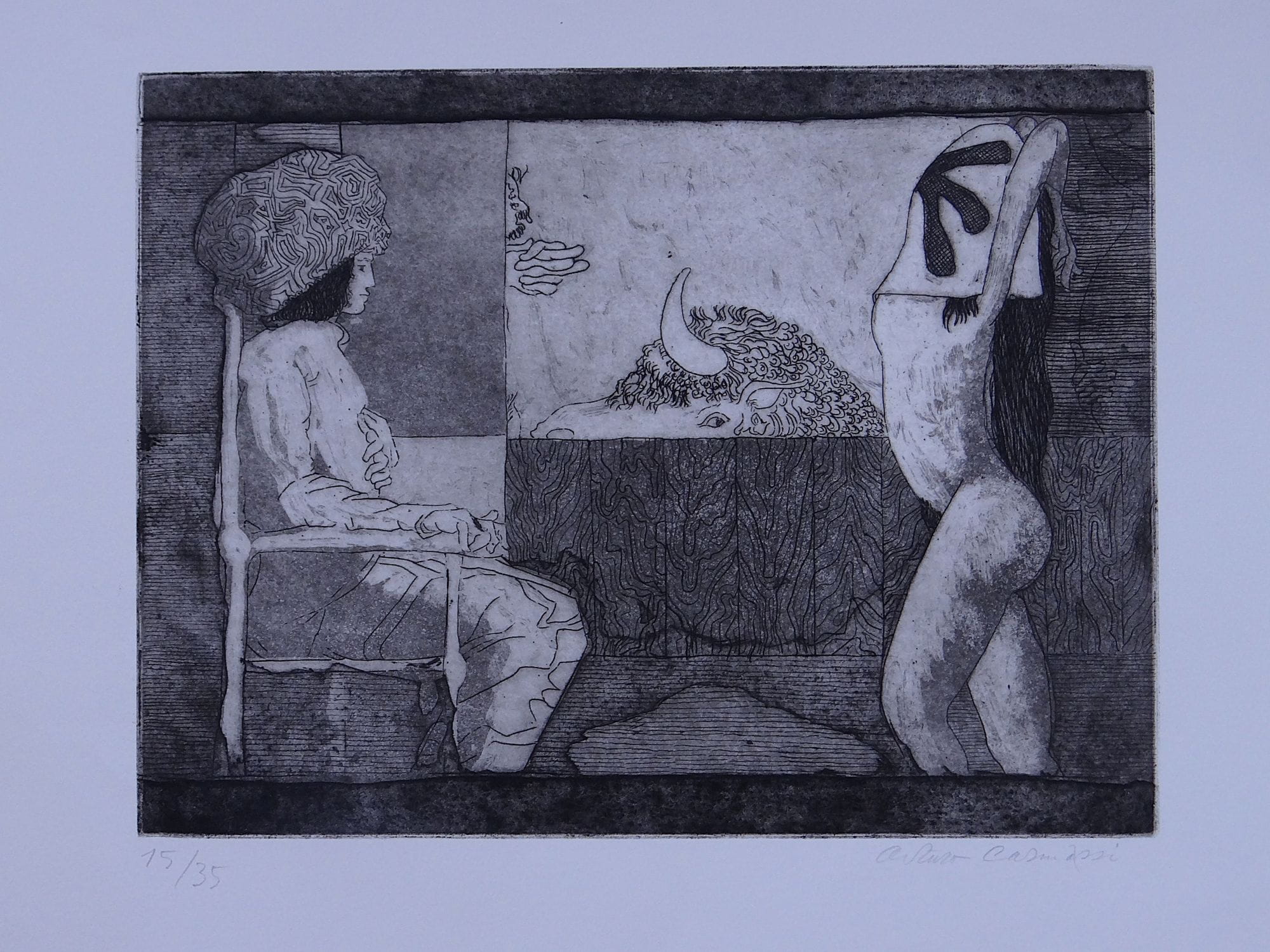 Cette œuvre évocatrice s’inspire de la mythologie grecque : le légendaire Minotaure, monstre mi-homme mi-taureau, prisonnier du labyrinthe inextricable construit par Dédale pour le roi Minos. Carmassi capture l’essence mythique d’Astérios (le Minotaure), né de Pasiphaé et du taureau de Crète, mêlant puissance surréaliste et fantaisie intemporelle. Un ajout parfait aux collections axées sur les mythes et légendes, les bestiaires mythologiques, les monstres fabuleux, les créatures imaginaires, l’art inspiré des mythes grecs ou les estampes d’inspiration surréaliste.