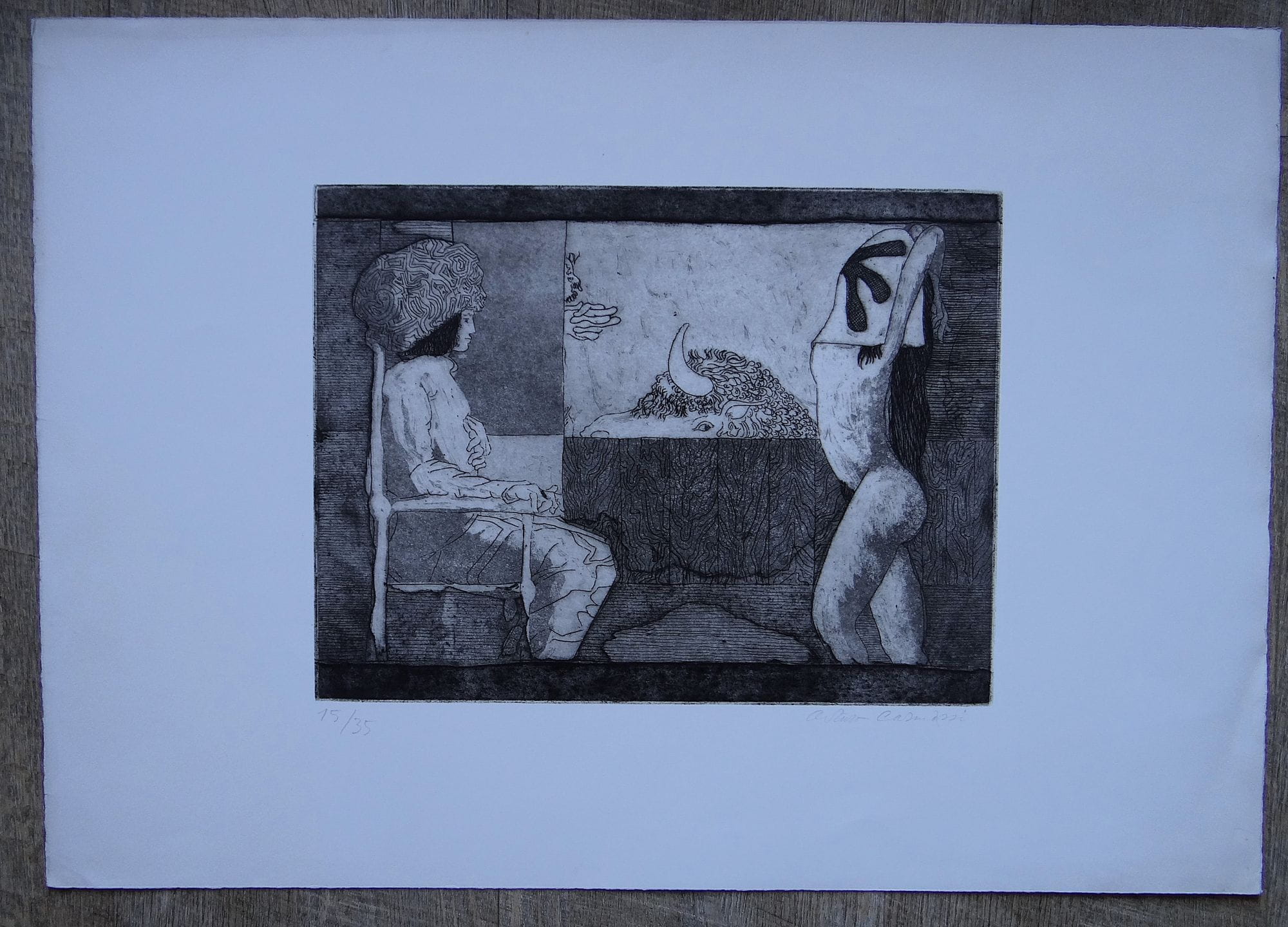 Discover this powerful original lithograph by renowned Italian artist Arturo Carmassi (1925–2015), hand-signed and numbered by the artist himself. Titled « The Prince, the Unicorn, and the Dancer », created in 1969.
