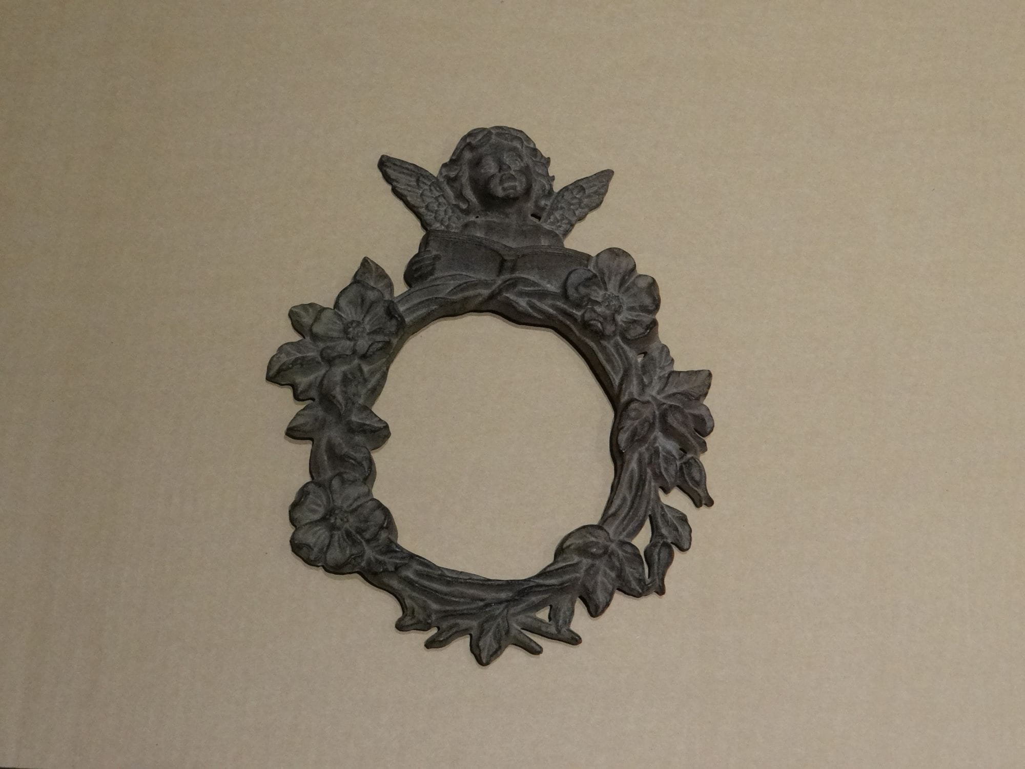 Cadre vintage en fonte – Ange chérubin avec couronne de fleurs
