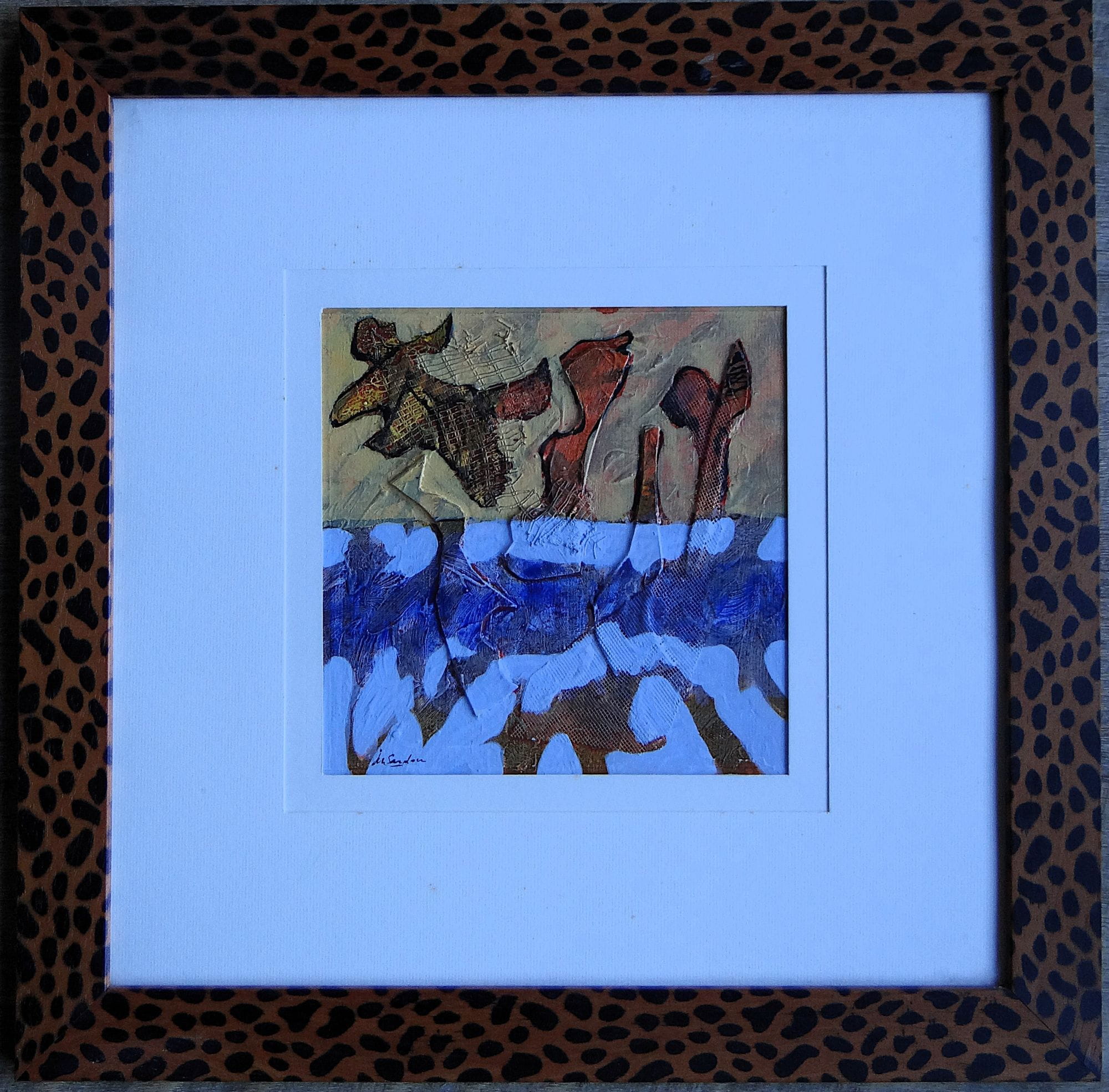 Cette technique mixte (peinture + collage) met en valeur la matière brute et les superpositions poétiques.