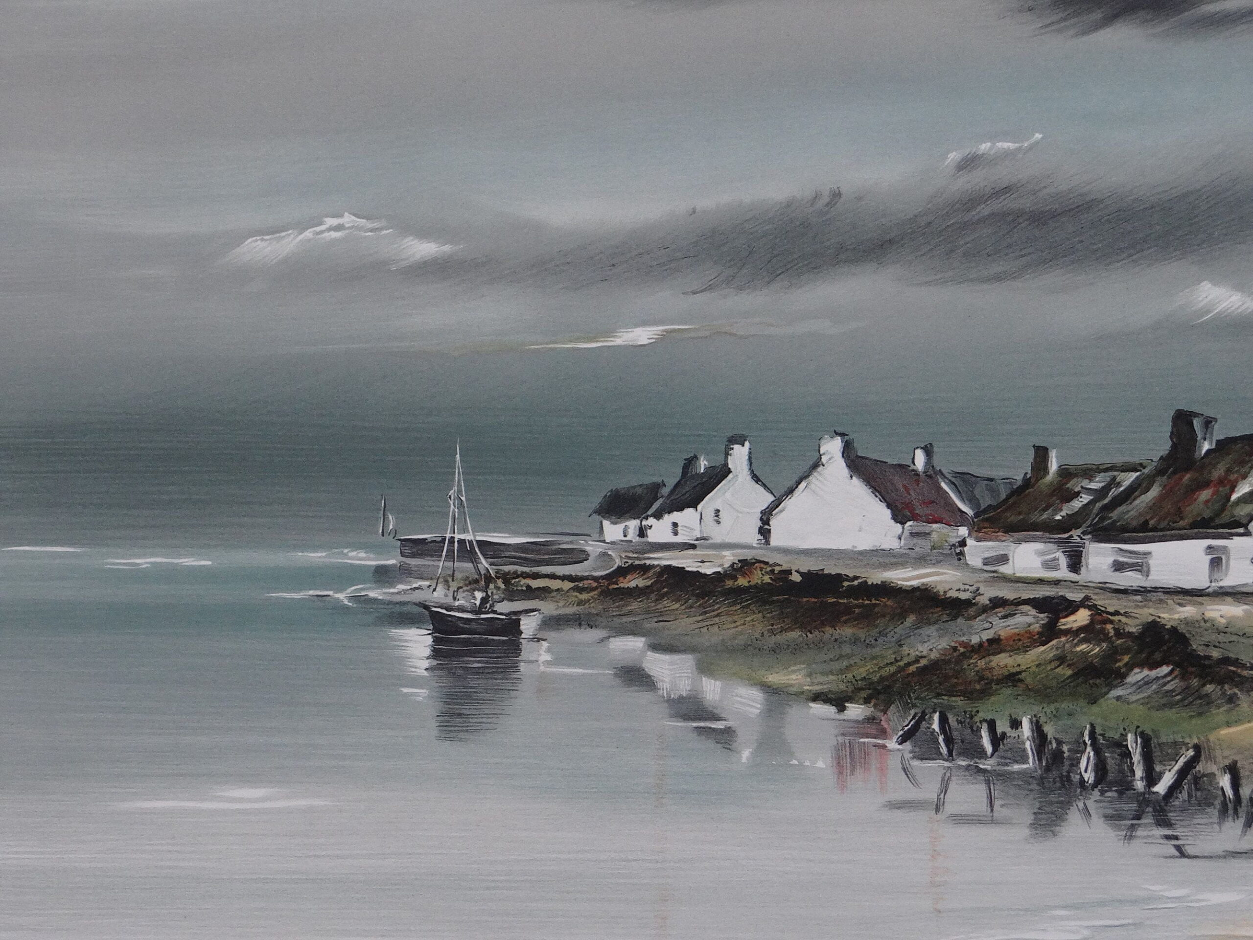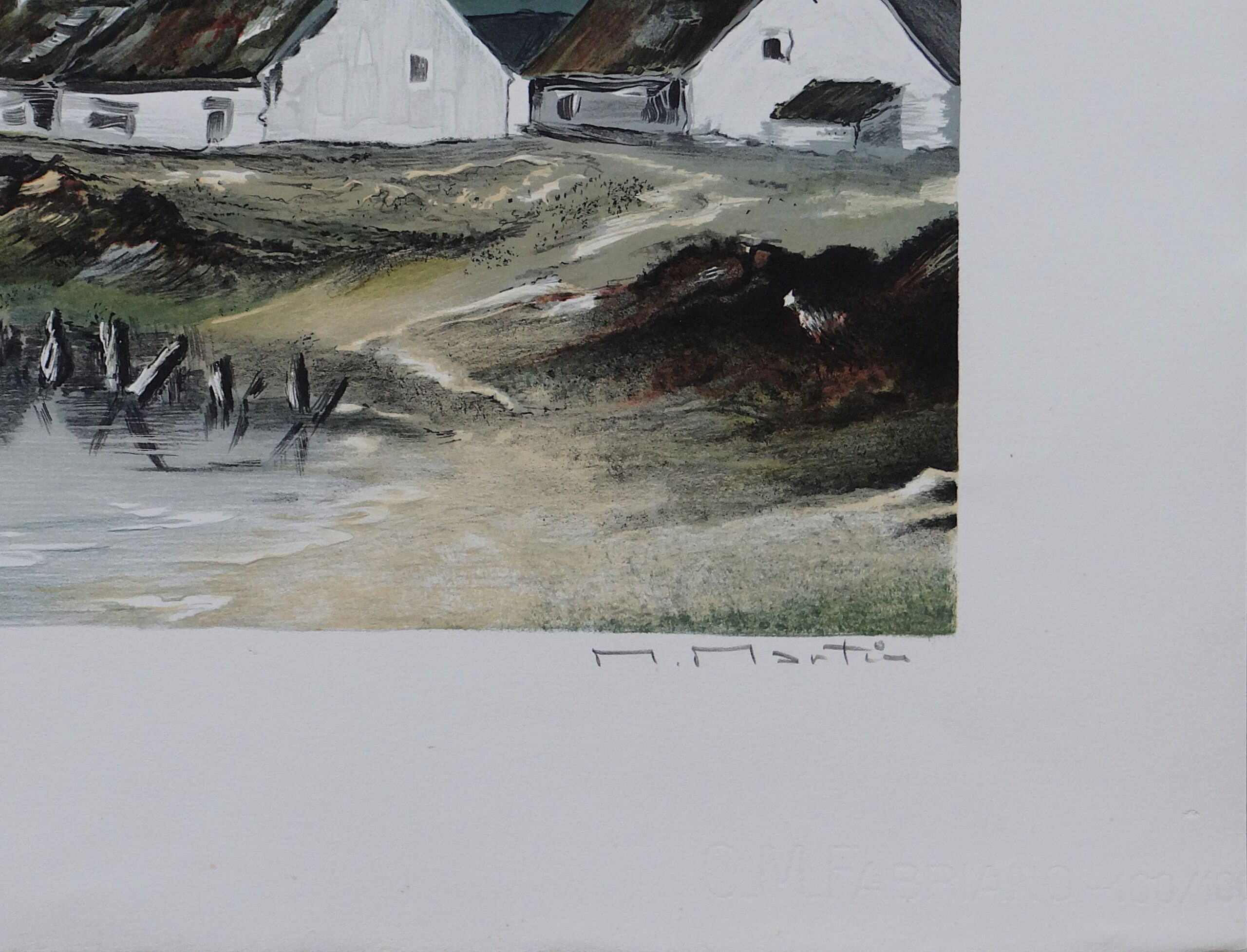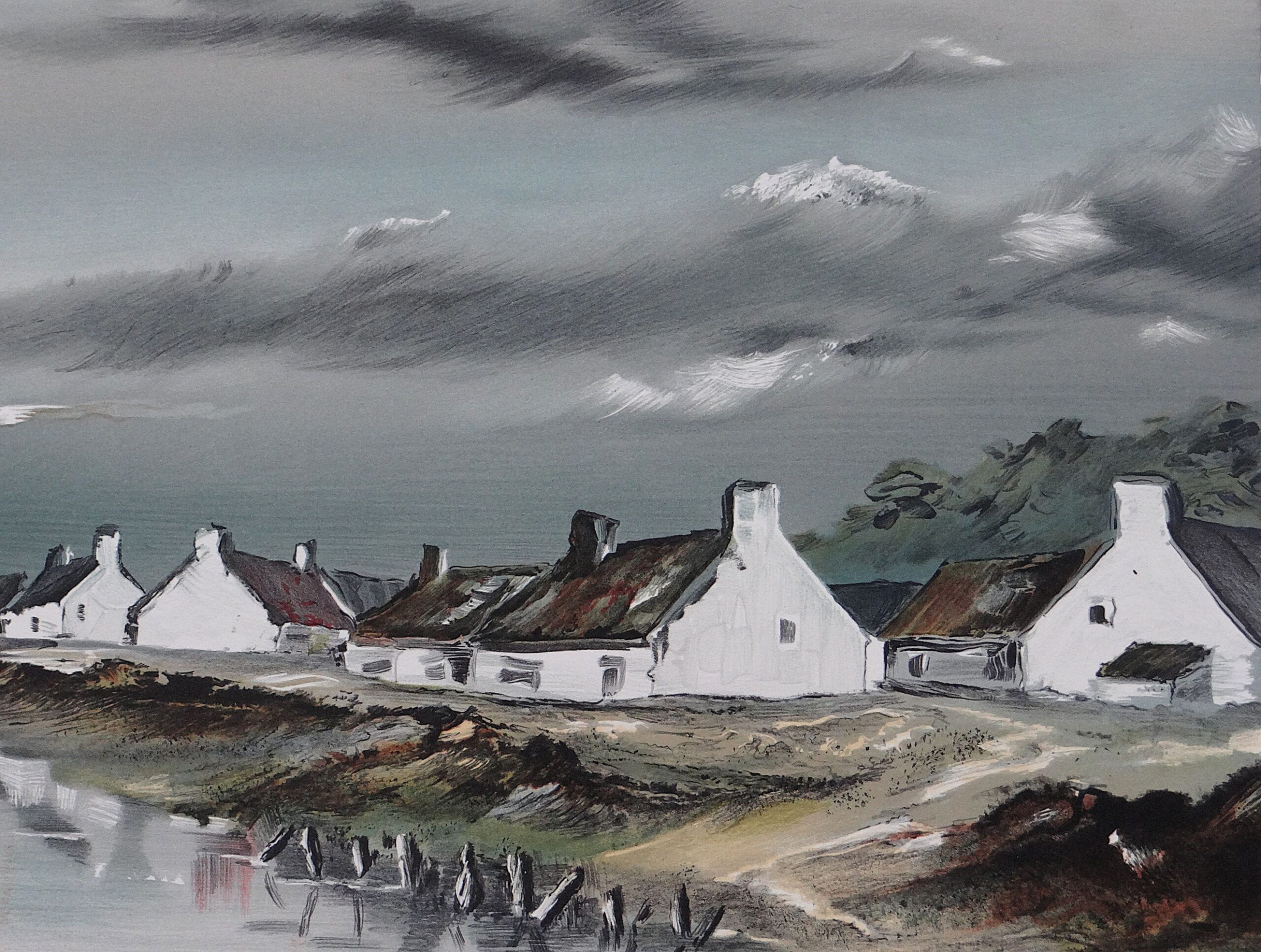 ✦ Cette lithographie signée Michel Martin capture avec force la puissance brute d’une tempête qui approche sur la côte escarpée du Finistère, en Bretagne. Trois maisons bretonnes blanches traditionnelles s’accrochent au rivage rocheux tandis qu’un petit voilier fragile lutte contre les vagues en revenant du large. Des nuages sombres et menaçants, des vagues écumantes et l’esprit indompté de la mer Iroise composent une scène d’une atmosphère saisissante.