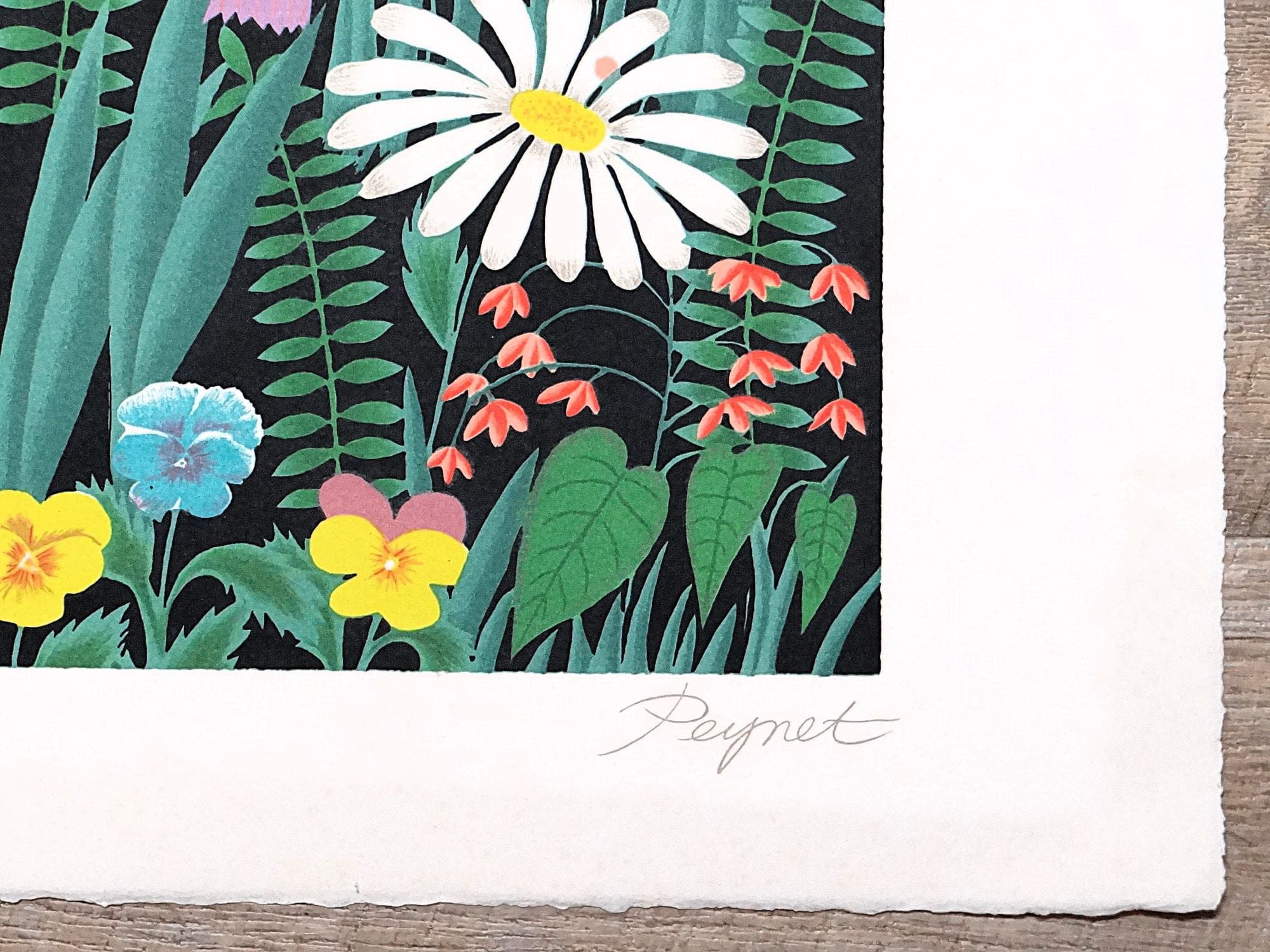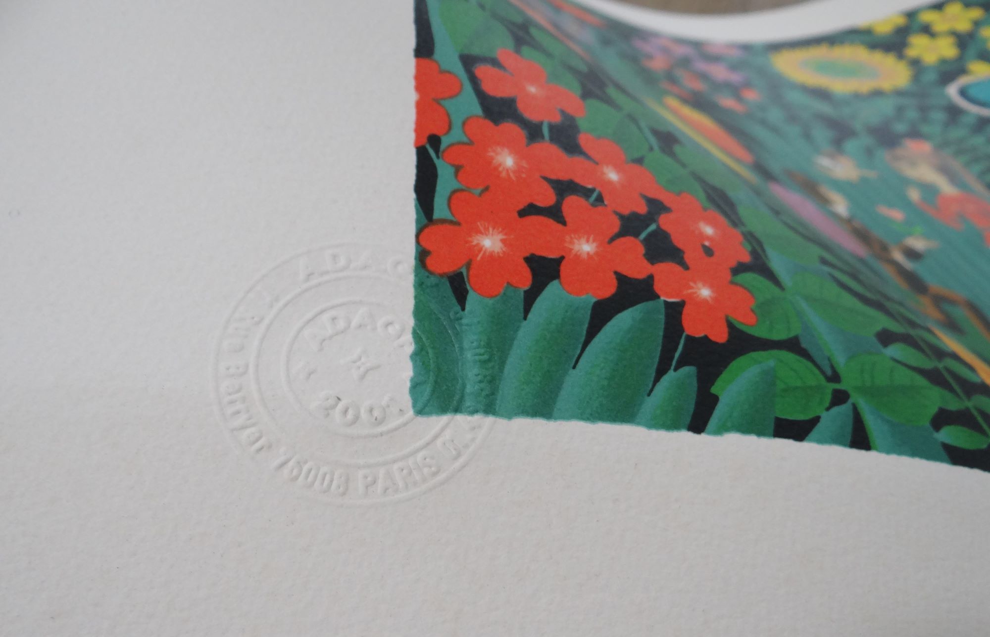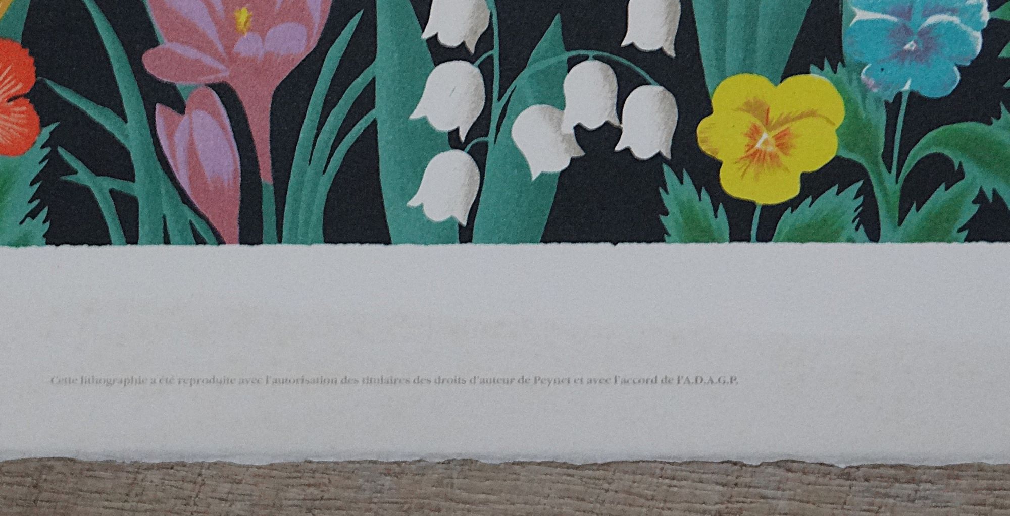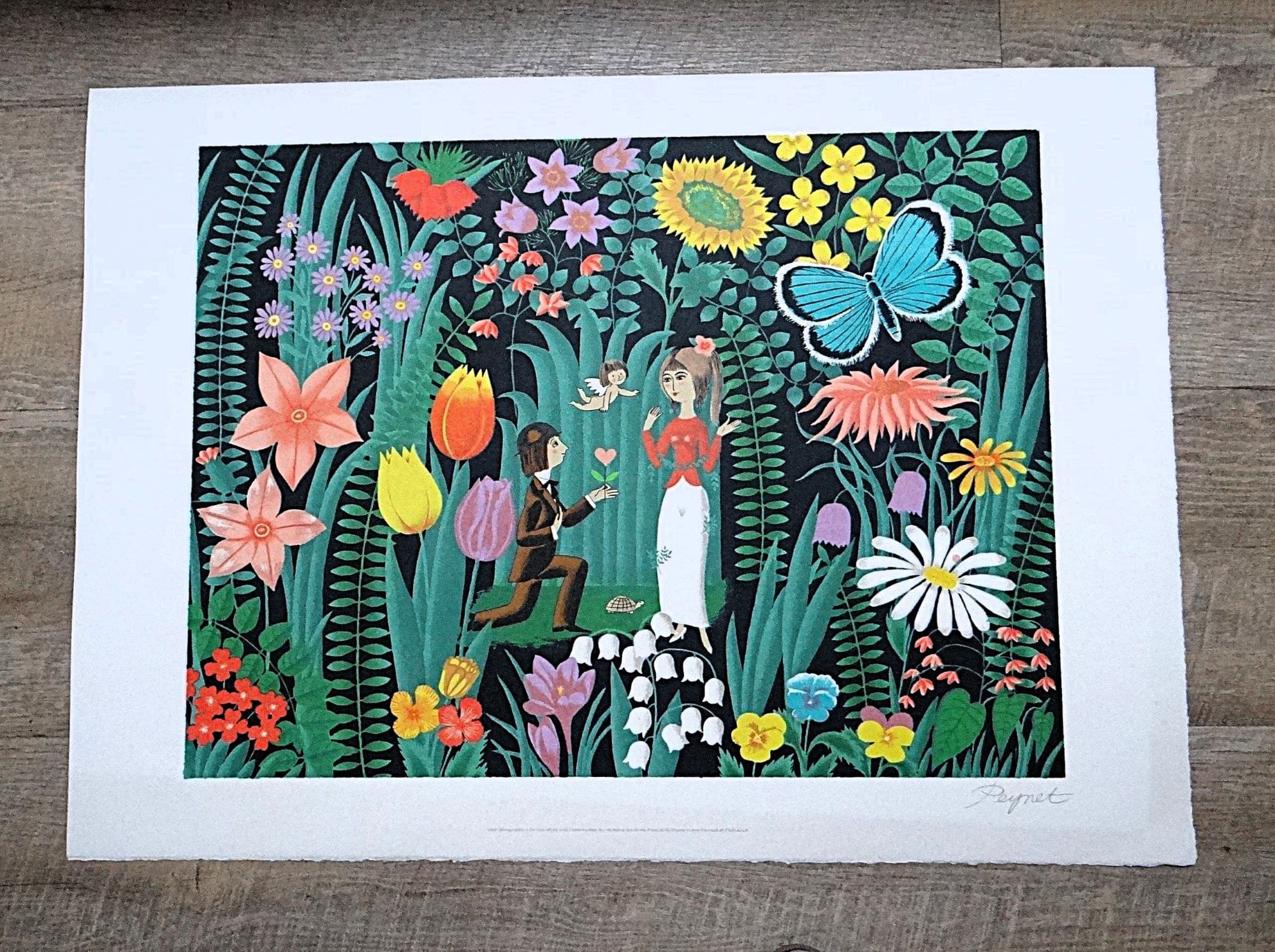 Raymond Peynet, lithographie d’interprétation signée représentant les célèbres « Amoureux de Peynet », une ambiance dans laquelle amour et romantisme, humour et tendresse riment avec bienveillance dans un couple. Lorsque Cupidon lance ses flèches, deux êtres tombent amoureux. Format horizontal. Dimensions : 75 x 54 cm. Très bon état. Signature dans la planche et cachet sec de l’ADAGP (société de gestion des droits d’auteur) en 2001. Vendue non encadrée.