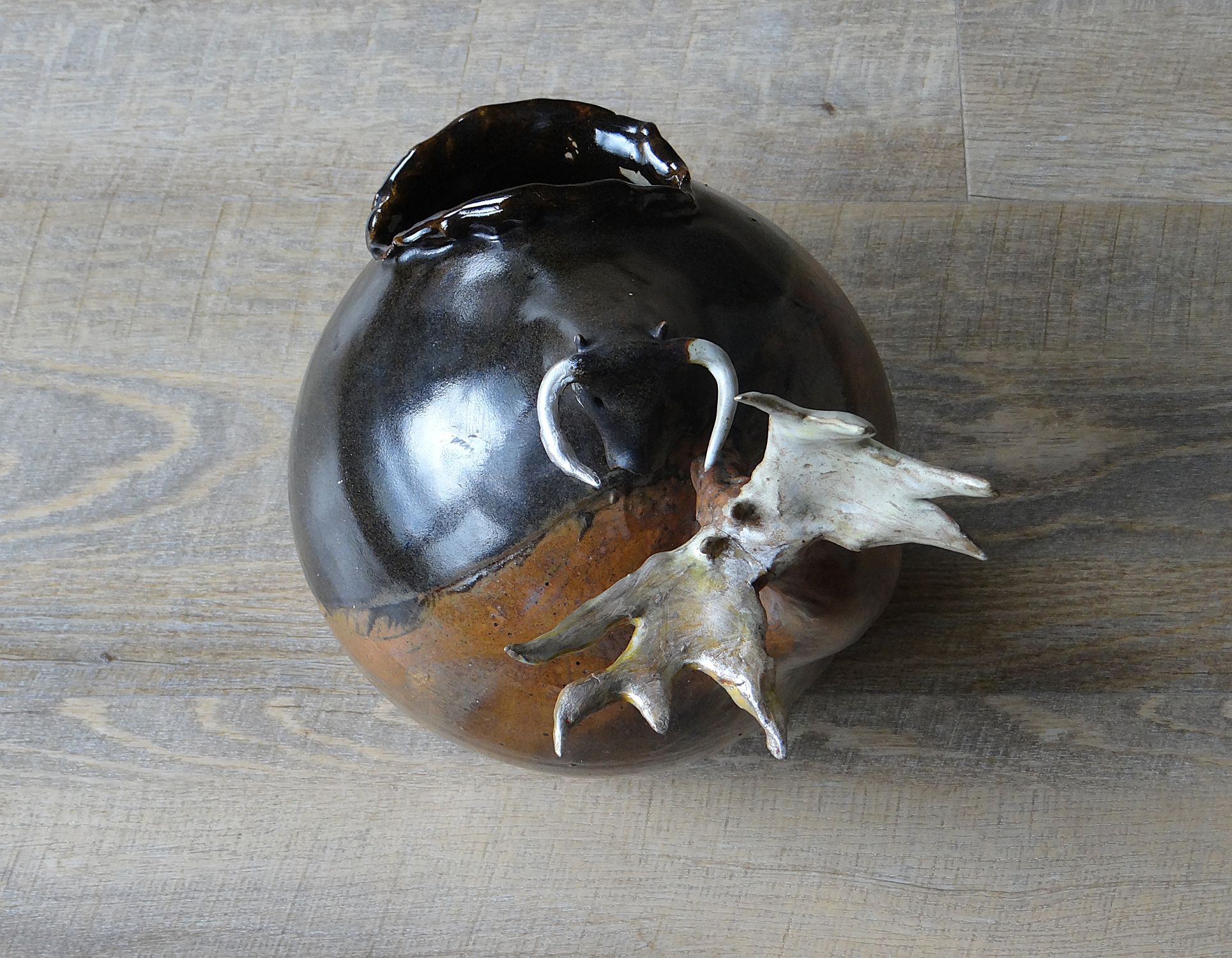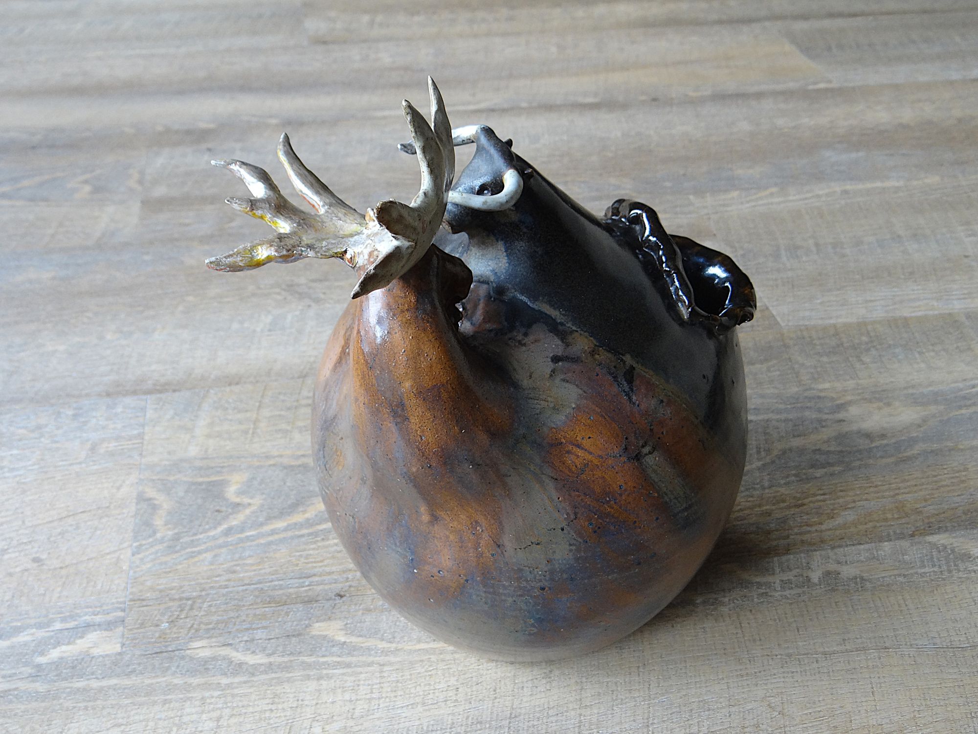 Vase sculpture de Alexandre Kostanda, le taureau et le cerf, poterie de Vallauris. Hauteur 33 cm. Diamètre environ 22 cm. Excellent état sauf un des bois du cerf a été cassé et recollé.