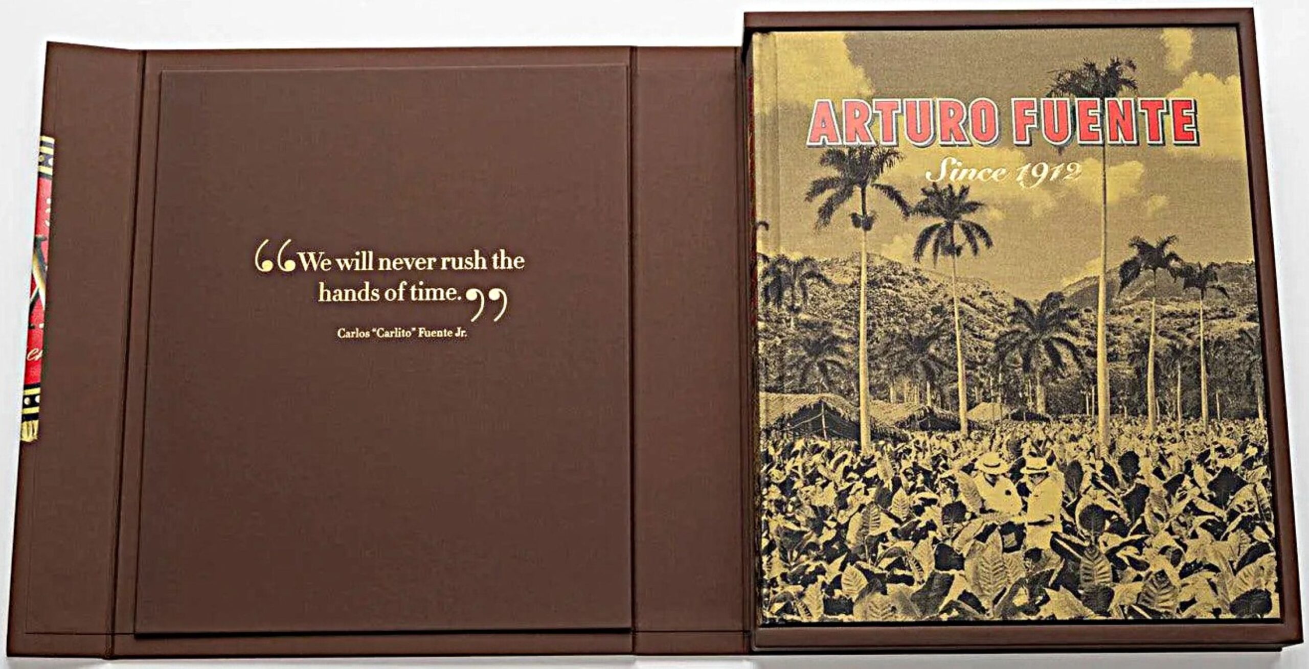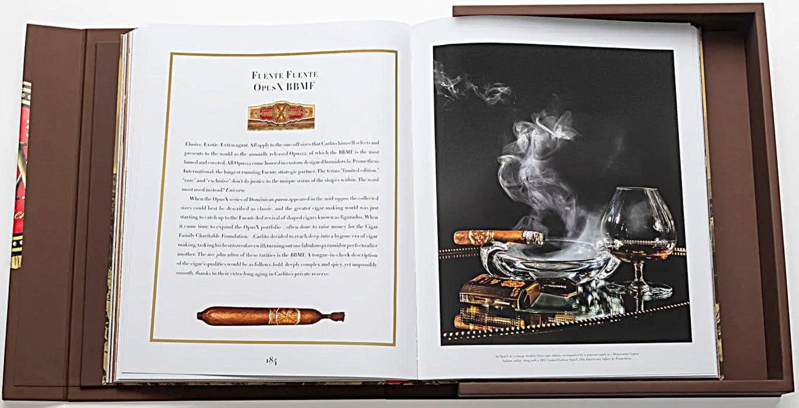 This large-format, hand-bound book, adorned with authentic cigar bands, is a must-have for any cigar connoisseur, especially Arturo Fuente enthusiasts.