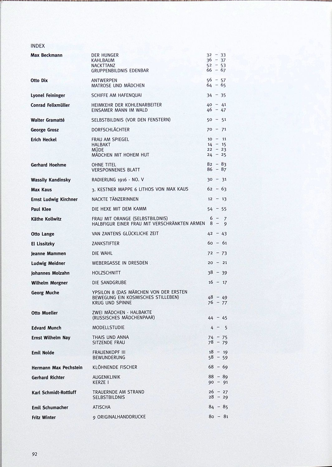 This book presents works on paper by two artists, a Norwegian Expressionist and a contemporary German artist, as well as numerous other artists from the same period (see the index in the photo). It offers an overview of the evolution of these artists’ work in this medium. In particular, it features works by Edvard Munch, known for “The Scream” and considered a precursor of Expressionism, and Gerhard Richter, a major German artist of contemporary art. The book focuses on works created on paper, a medium that both artists used throughout their careers.