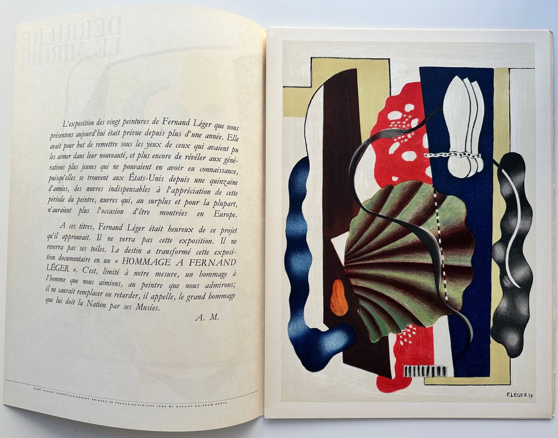 Rare original Derrière le Miroir issue published in October 1955 by Galerie Maeght, Paris, as a tribute to Fernand Léger (1881-1955) following his death. This triple special issue (nos. 79-80-81) accompanied the “Hommage à Fernand Léger” exhibition (paintings from 1920-1930) at the Galerie Maeght. – Excellent vintage condition.