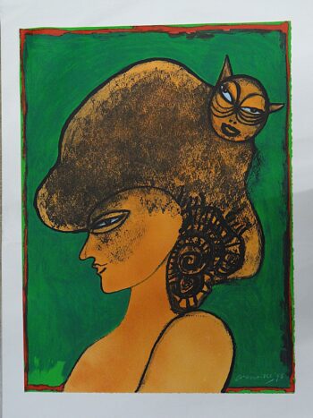 Guillaume Corneille, the woman with the cat, original signed lithograph, Dutch painter, portrait, extravagant woman, love of cats,