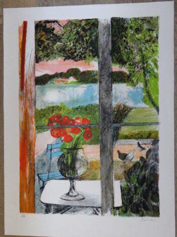 Lithographie originale signée de Guy Bardone – Vue sereine vers un lac avec un bouquet de coquelicots