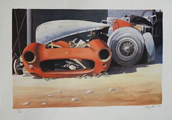 Alain Mirgalet, lithographie originale signée et numérotée, Epave d’artiste, véhicule disloqué, voiture en pièces détachées, Ferrari 250 GT SWB, bagnole à la casse,