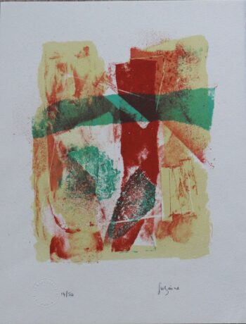 Lithographie abstraite de Suzaine, signée 14/50, ocre rouge vert Gutai