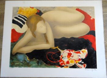 Alain Bonnefoit, lithographie originale signée et numérotée, nu à la peluche, vacances à la plage, portrait dévêtu, sensualité dans l’art, décoration estivale,